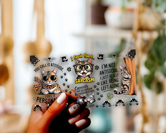 Cat Sarcasm 16oz UV DTF Wrap for Libbey Glass Can | Peel & Stick Cup Wrap | Waterproof & Scratch Resistant Tumbler Decal